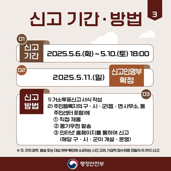 2025년 5월 6일(화)부터 5월 10일(토) 오후 6시까지 신고가 가능합니다. 거소투표 신고서를 작성하여 주민등록지의 구·시·군 또는 읍·면·동 주민센터에 제출해야 합니다.