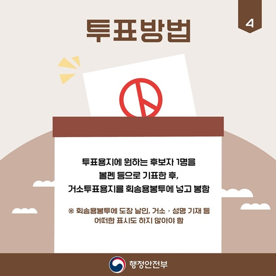 기표는 본인이 직접: 투표는 반드시 본인이 해야 하며, 대리투표는 불법입니다.
