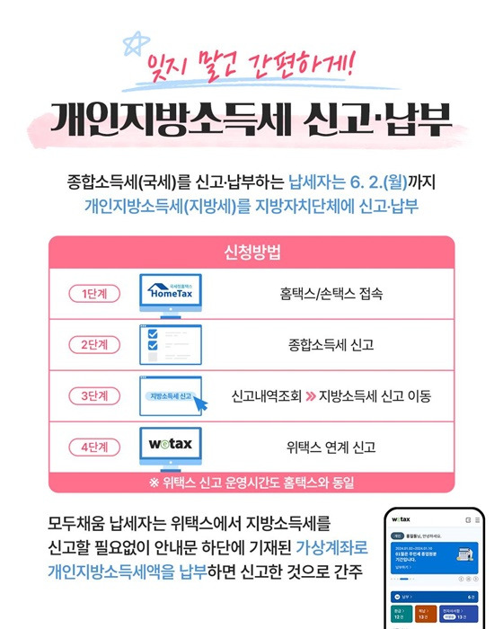 한편, 종합소득세 신고자라면 개인지방소득세(지방세) 신고도 함께 이뤄져야 합니다. 국세인 종합소득세와는 별도로 지방자치단체에 신고·납부해야 하며, 위택스를 통해 간편하게 신고할 수 있습니다. 특히 모두채움 납세자의 경우, 안내문에 적힌 가상계좌로 지방세를 납부하면 자동으로 신고한 것으로 간주되므로 편리함을 활용하시기 바랍니다. 또한, 종합소득세의 납부기한이 연장된 경우에는 개인지방소득세의 납부기한도 자동으로 연장되며, 지자체에 별도로 연락하거나 신청할 필요 없이 적용됩니다.