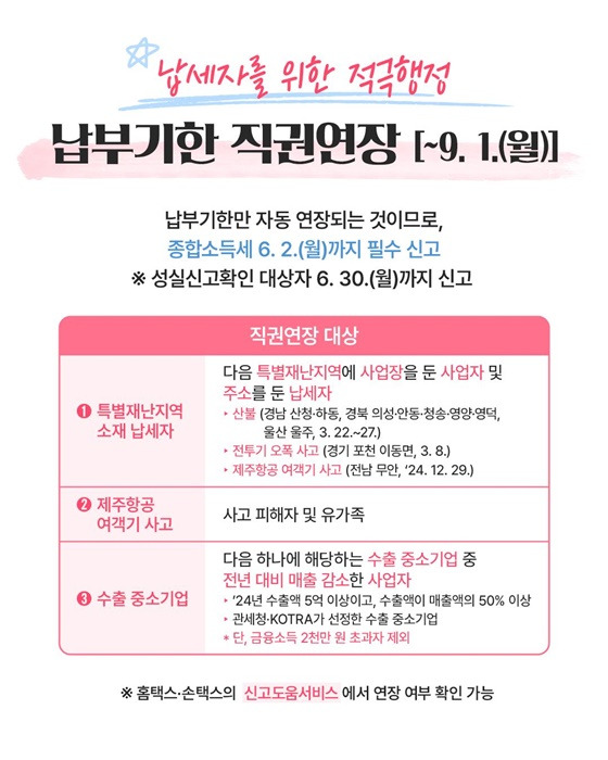 홈택스 또는 손택스에서 제공하는 신고도움서비스를 통해 본인이 납부기한 연장 대상인지 확인할 수 있으니 반드시 확인해 보시기 바랍니다.