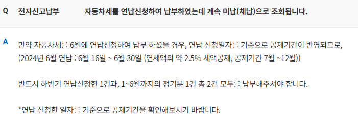 연납 공제율 축소: 연납 공제율은 2022년까지 10%, 2023년 7%, 2024년부터는 5%로 줄어들면서, 1월에 연납한 차량 수가 약 4만6000대 줄었습니다. 이에 따라 6월 정기 고지 대상 차량이 늘어났습니다.