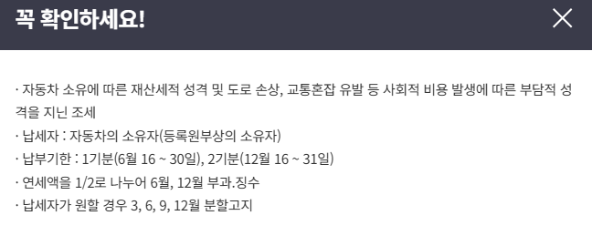 자동차세는 단순한 세금이 아니라 차량 소유자의 책임입니다. 정해진 기간 내에 정확히 납부하여, 신뢰받는 납세자이자 책임 있는 시민으로서의 의무를 실천해보시기 바랍니다.
