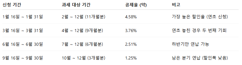 다만, 1월이나 3월에 연납(연세액 일시납부)을 한 경우 해당 납부 기간에는 고지되지 않으며, 중간에 차량을 등록·말소한 경우에는 일할 계산으로 세금이 부과됩니다.