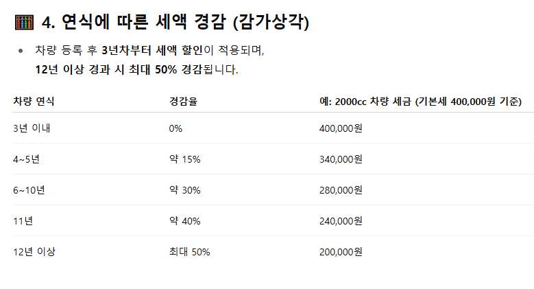 등록 후 3년 이상 된 차량은 감가상각 적용으로 세액이 최대 50%까지 경감됩니다.