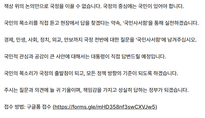 이 플랫폼은 단지 의견을 접수하는 창구에 그치지 않고, 국민이 정책 결정 과정의 중심에 서도록 하겠다는 국정 철학을 담고 있는 시도입니다. 이제 국민은 단순한 청중이 아닌, 국정을 함께 만드는 ‘주체’로 더 확실히 자리 잡아가고 있습니다.
