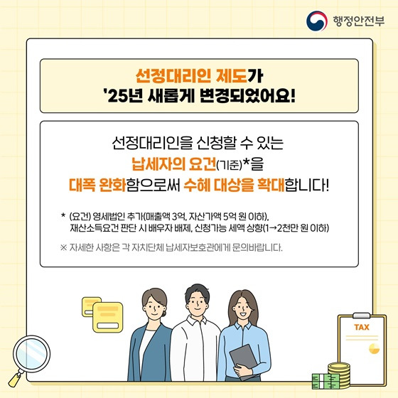 2025년부터 선정대리인의 자격 요건이 대폭 완화되어 더 많은 납세자가 지원받을 수 있게 되었습니다.