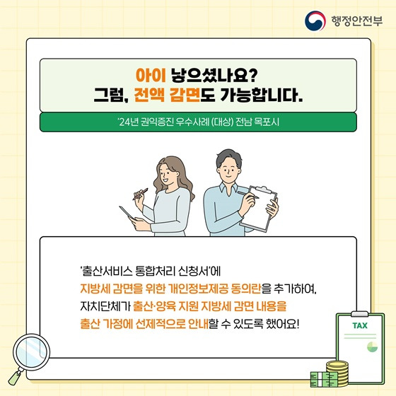 2024년 전남 목포시에서는 ‘출산서비스 통합처리 신청서’에 지방세 감면 동의란을 더해, 출산가정에게 지방세 감면 혜택을 선제적으로 안내하였습니다.