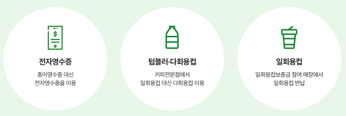 일회용컵 보증금제 참여매장에서 일회용컵 이용 후 반환하기: 일회용컵 보증금제 매장에서 컵을 반환하면 포인트가 적립됩니다.