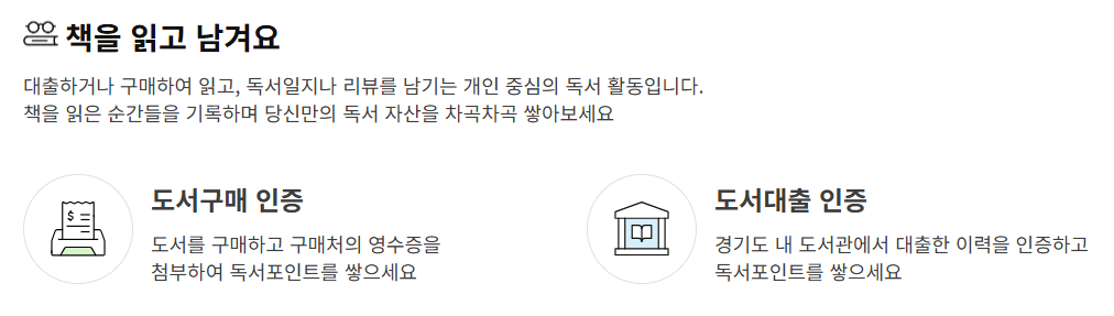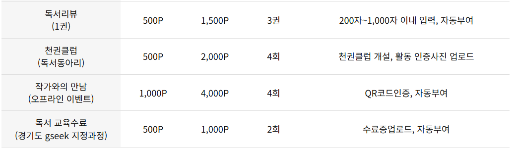 도서대출: 1,000P (월 2권, 경기도 내 도서관, 전자책 월 1권 인정)