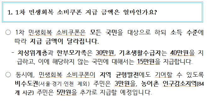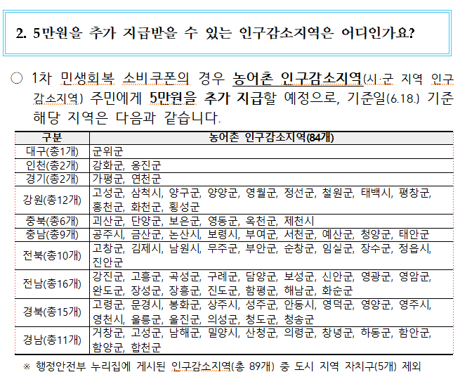 특히 서울, 경기, 인천을 제외한 비수도권 지역 주민에게는 3만원이 추가 지급됩니다. 여기에 소멸 위기를 겪고 있는 농·어촌 인구감소지역(84개 시·군) 주민에게는 5만원이 더해집니다.