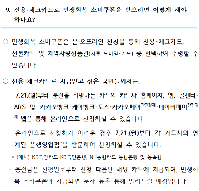 온라인 신청은 24시간 가능하며, 오프라인 신청은 평일 오전 9시부터 오후 6시까지(은행 영업점은 오후 4시까지) 가능합니다. 신용·체크카드는 신청 다음 날 바로 소비쿠폰이 지급되며, 기존 카드포인트와 별도로 관리됩니다.