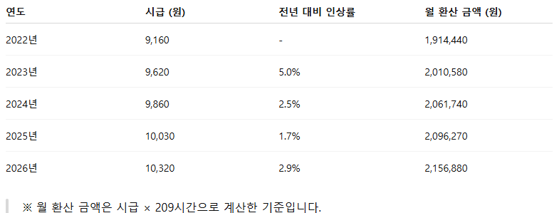 2026년도 최저임금은 2025년 대비 290원이 인상된 시간당 10,320원으로 결정되었습니다. 이는 인상률로 보면 약 2.9%이며, 월급으로 환산하면 (월 소정근로시간 209시간 기준) 약 2,156,880원입니다.