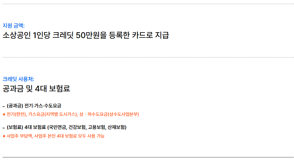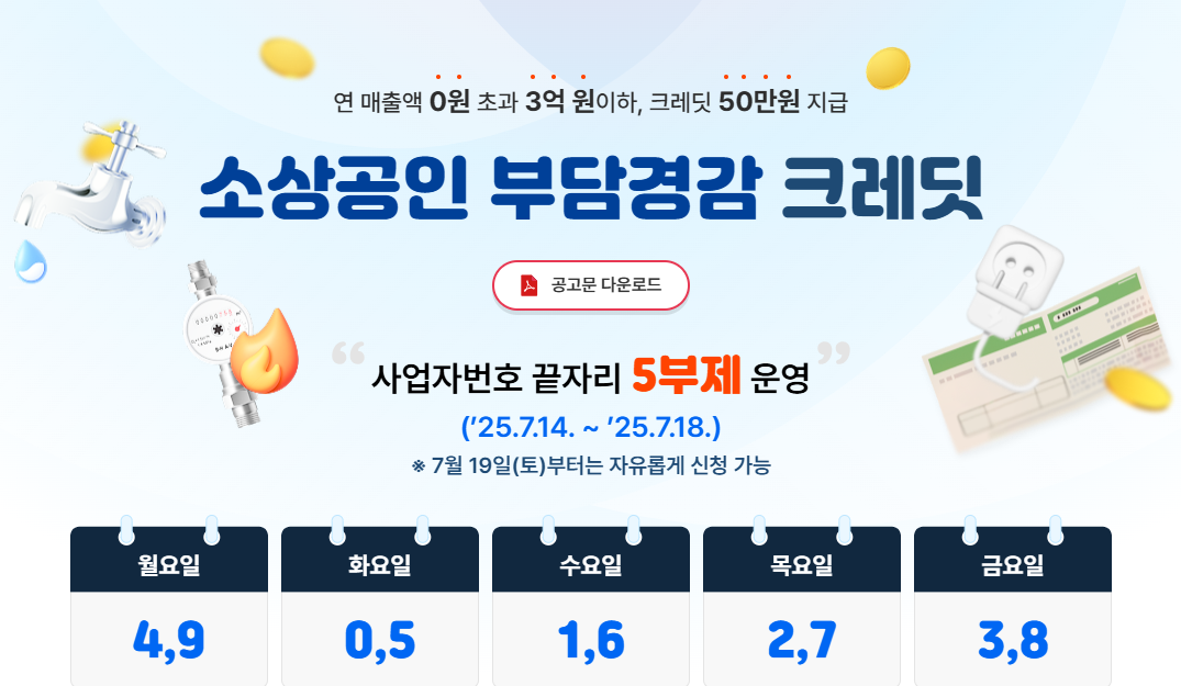 전기, 가스, 수도요금 등 공과금과 4대 보험료 납부에 사용할 수 있는 50만 원 한도의 크레딧(포인트)을 지원하는 이 사업은, 실질적인 경영비용 절감 효과를 기대할 수 있어 많은 소상공인들의 관심을 받고 있습니다.