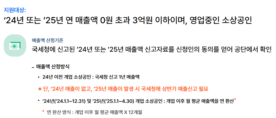 매출액 기준은 국세청에 신고된 매출자료를 기준으로 하며, 별도의 매출 증빙서류를 제출할 필요는 없습니다. 1인이 여러 사업체를 운영하더라도 한 곳만 신청할 수 있습니다.
