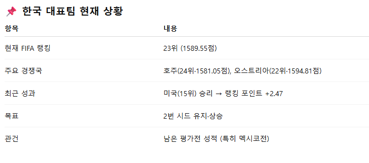 현재 한국은 FIFA 랭킹 23위입니다. 바로 아래에는 호주(24위)가 바짝 추격하고 있고, 위로는 오스트리아(22위)가 있습니다. 멕시코, 미국과 같은 북중미 강호들과의 평가전 결과가 직접적으로 시드에 영향을 줄 수 있는 상황이기 때문에, 한국은 A매치 한 경기 한 경기에 사활을 걸어야 하는 입장입니다.