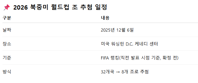 이번 북중미 월드컵 역시 10월 혹은 11월 발표 랭킹을 기준으로 할 가능성이 크지만, FIFA가 공식적으로는 “추첨식 날짜만 확정되었다”고 밝혀 아직 불확실성이 남아 있습니다.